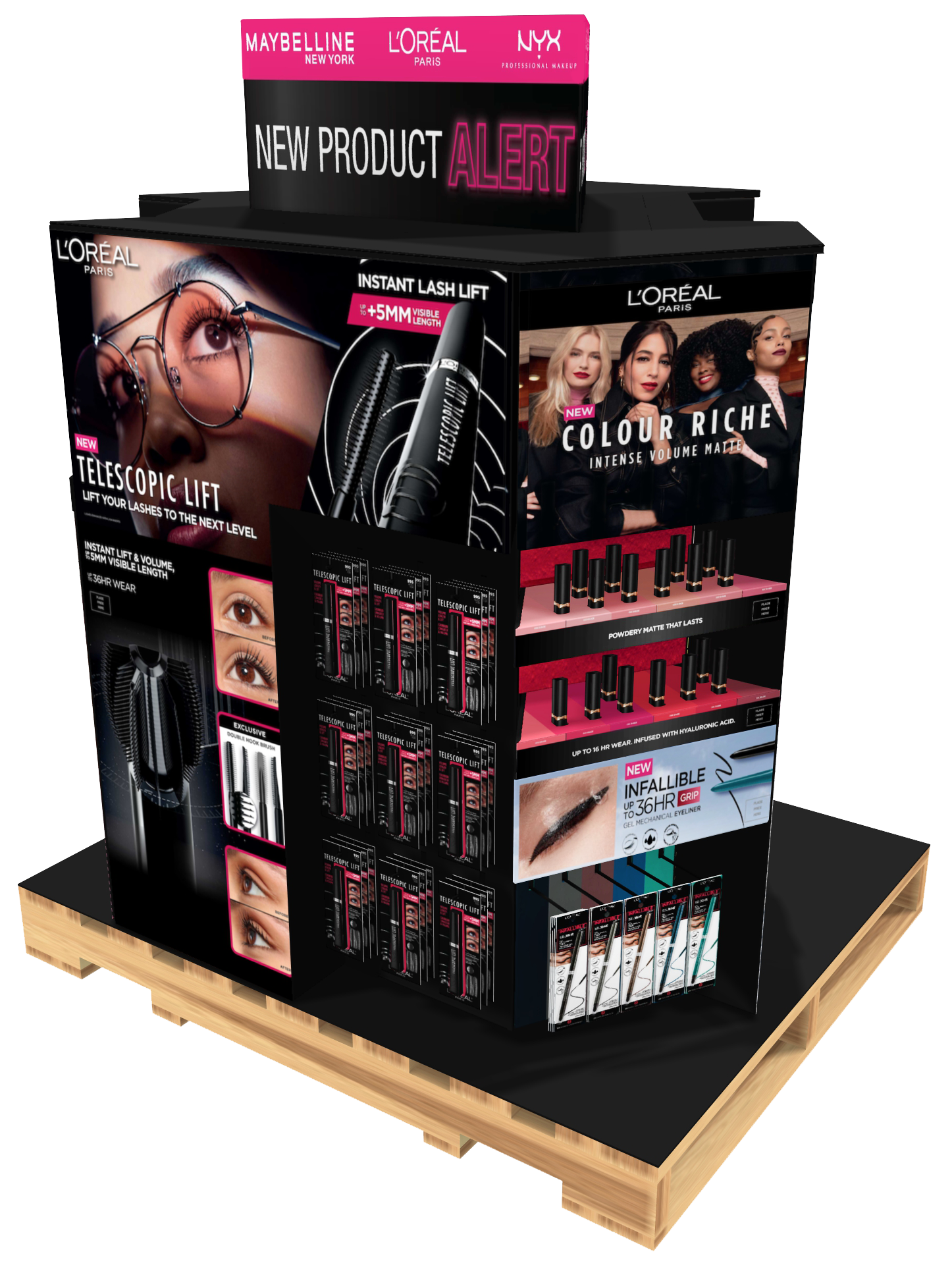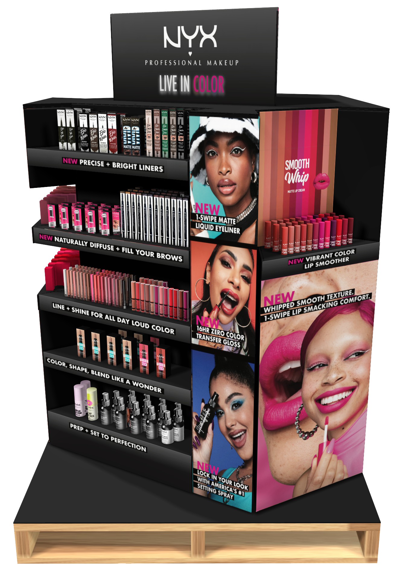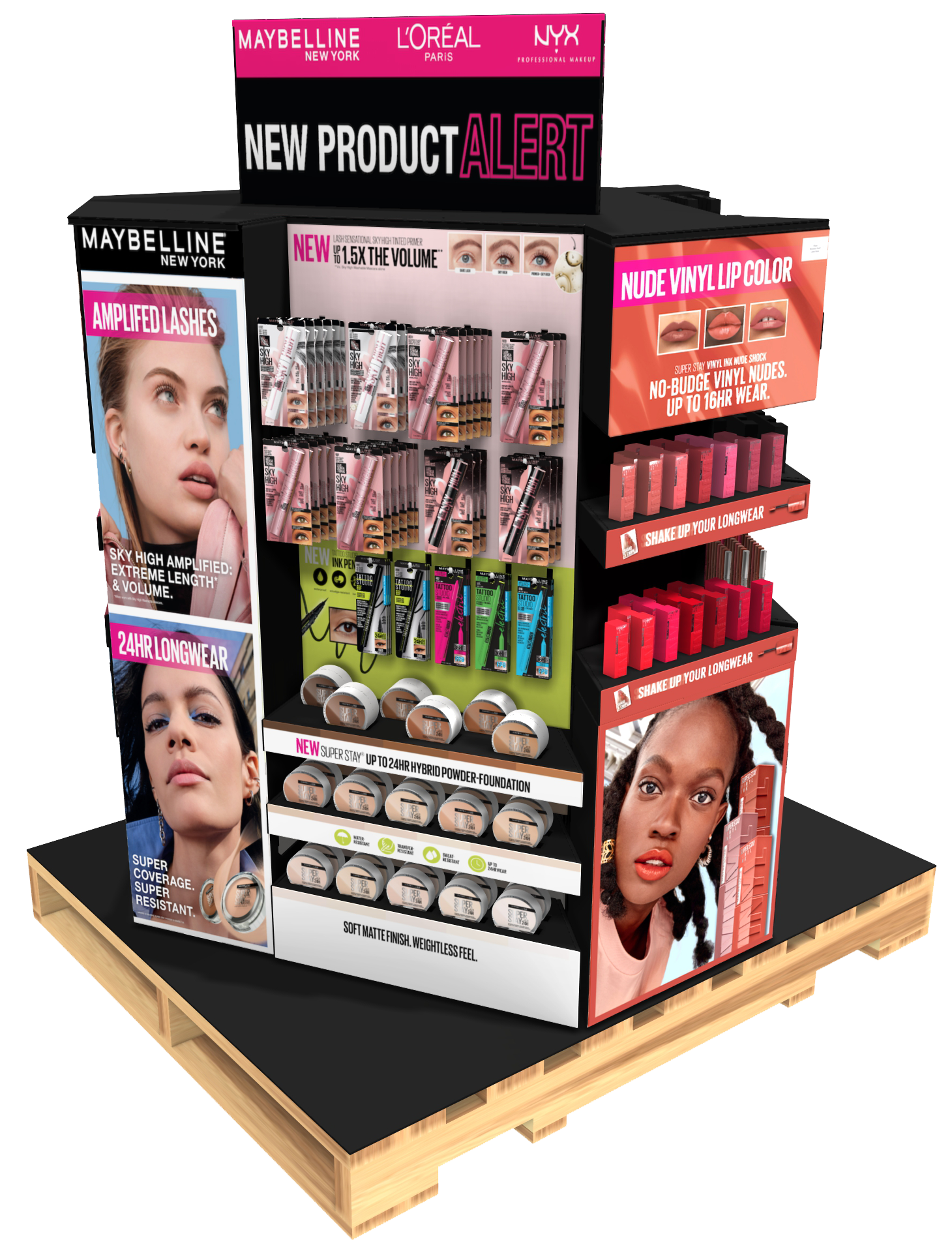 This design is a 6-sided “WOW” display featuring the iconic cosmetic brands, L’Oreal Paris, Maybelline, & NYX. The unique hexagon structure and floating shelves are a show stopper in themselves —- add these daring, bold graphics to each side and this display is truly unforgettable!