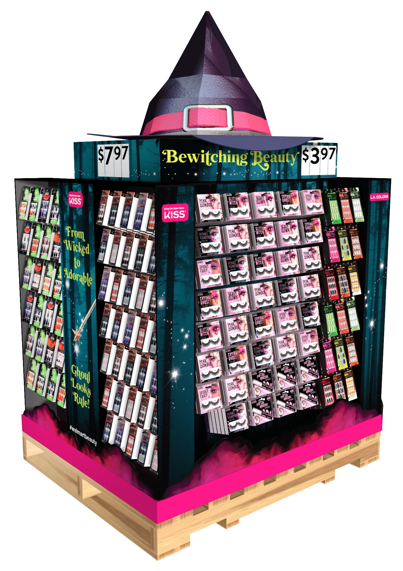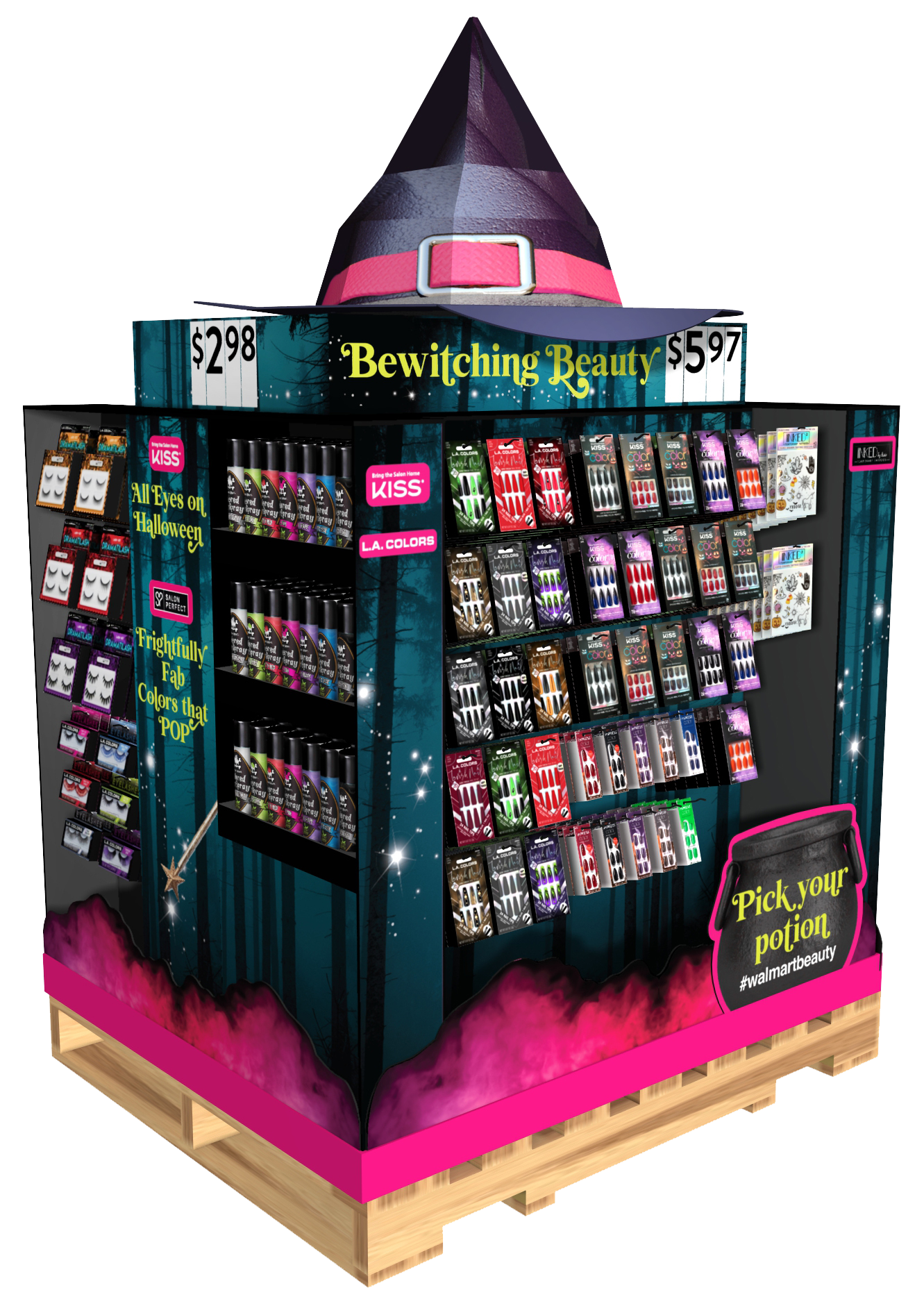 The creative campaign for this display is truly bewitching. The pallet features beauty products across multiple categories and several suppliers. The background imagery is intentionally dark with contrasting pops of vivid neon pink and green. Mystical and witchy design elements bring the brands together as both a spooky and fun Halloween concept.
